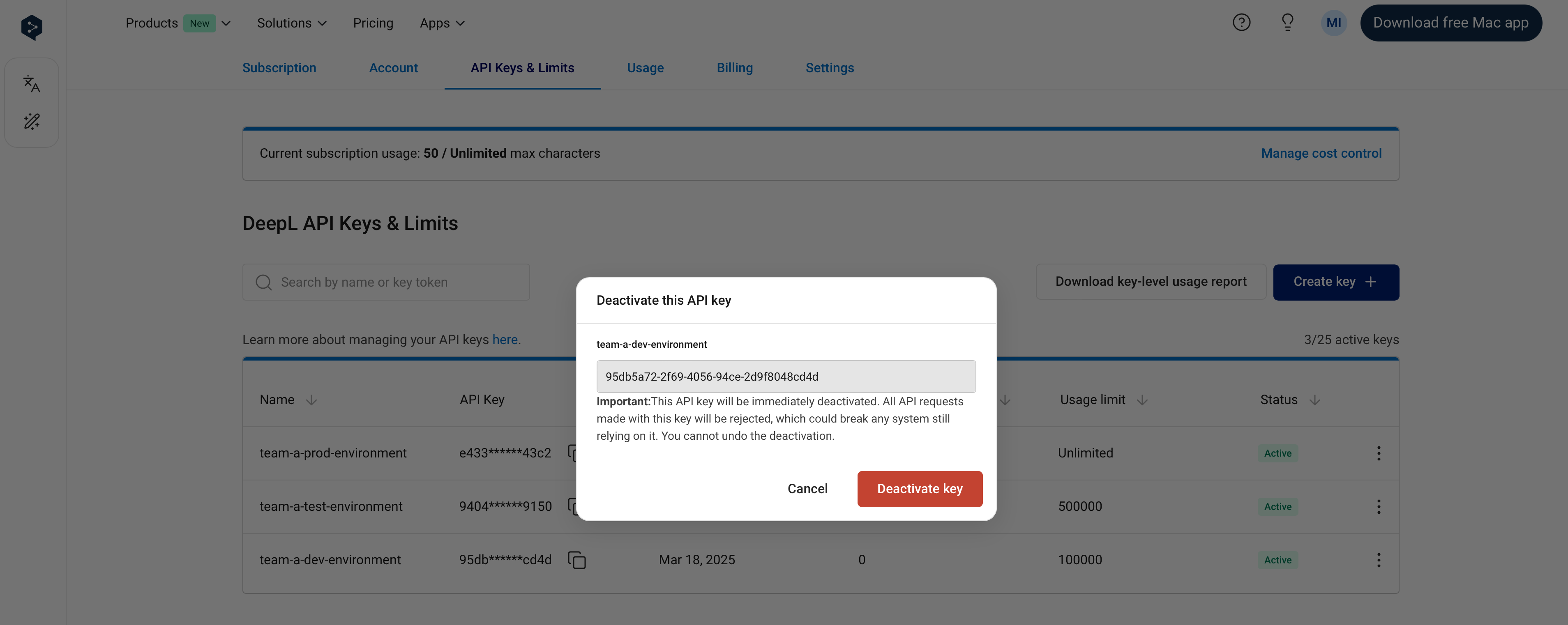 You can find and manage your API keys in the “API Keys & Limits” tab when signed into your DeepL API account. It’s possible to create multiple, simultaneously active API keys in a single API subscription.